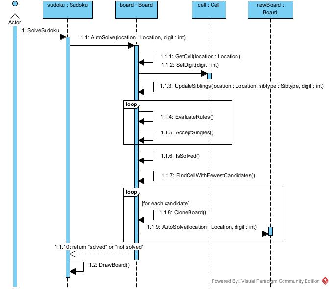 The diagram above shows the refinement of the useability requirement "Autosolve". In step 1 the actor asks the sudoku object, which represents the UI (User Interface), to solve the sudoku puzzle. In step 1.1 the sudoku object activates the board object to manage the work to be done. The first time AutoSolve is called without parameters, therefore 1.1.1 GetCell, 1.1.2 SetDigit and 1.1.3 UpdateSibling are skipped. In the first loop the board evaluates the 6 basic rules and accepts resulting singles until there are no more singles to accept. In step 1.1.6 the board checks whether the puzzle has already been solved or not. If solved, the board returns in 1.1.11 "solved". In step 1.1.7 the board looks up the cell with the fewest candidates. For each candidate the board creates in 1.1.8 a new board and sends the message AutoSolve to this new board object. Now AutoSolve is sent with 2 parameters, the location of the cell with the fewest candidates and the candidate value. The new board gets in 1.1.1 the cell with the given location, sets in 1.1.2 the candidate value and removes in 1.1.3 the candidate form all siblings in the row, the column and the box. Then the other steps are repeated over and over again until the puzzle has been solved or an invalid state occured.