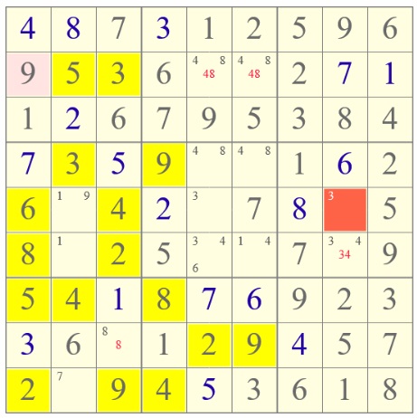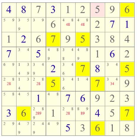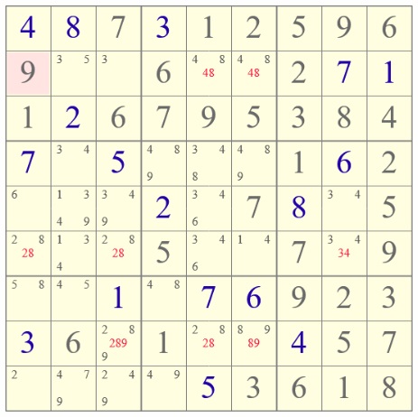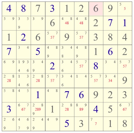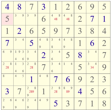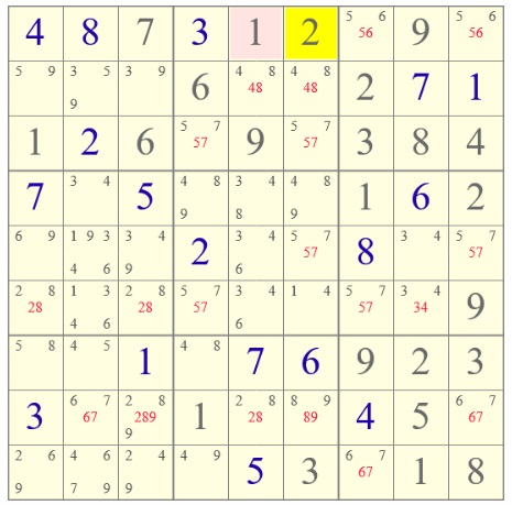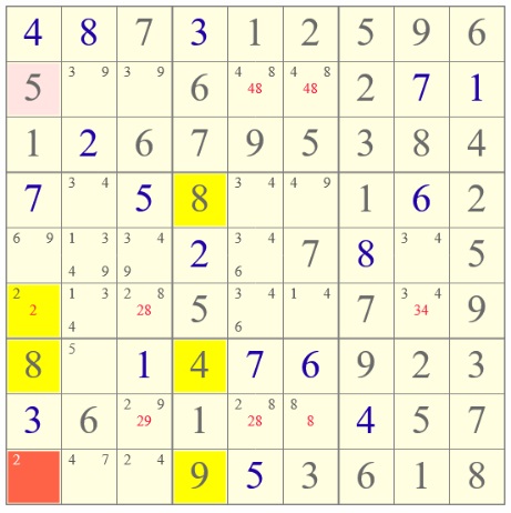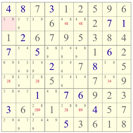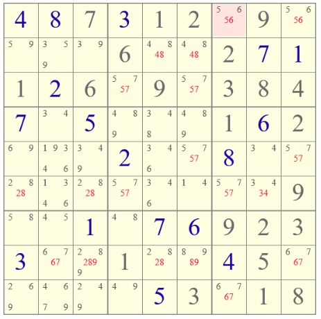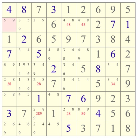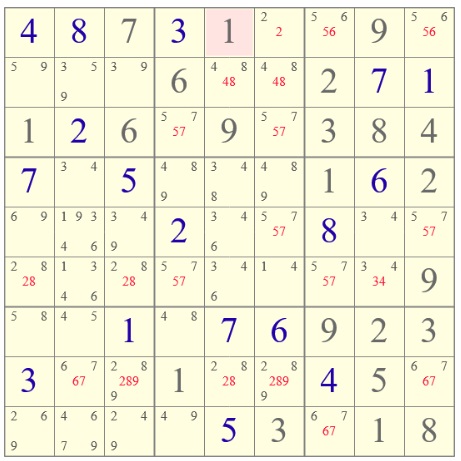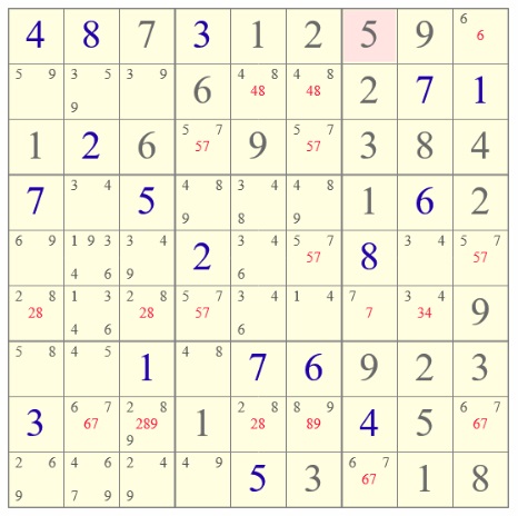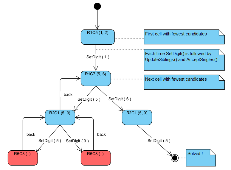 The diagram above depicts a state diagram for a board during the auto solve process. During this iterative process each time the operations SetDigit(), UpdateSiblings() and AcceptSingles() cause a new state of the board, valid or invalid (color red). When an invalid state occurs, the solve process returns to the previous state and continues with the next cell candidate. When there are no more candidates (see R2C1) the solve process returns to a a previous state as well. Technically this process is called backtracking.